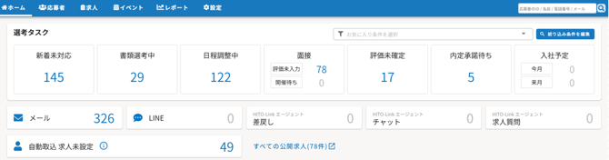 HITO-Linkエージェントに関する必要タスクも確認することができるので、差し戻された求人の対応や、エージェントとのチャット対応などで対応必要なものがどのくらいあるのか、わかりやすくなっています。
