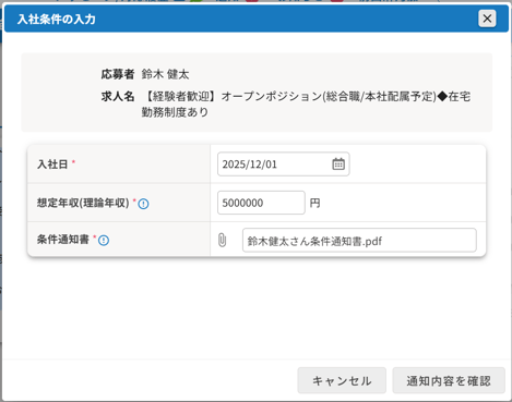 3.入社日、想定年収、条件通知書(指定書式はありません)を入力し、〔通知内容を確認〕をクリックします。内容を確認して、〔上記内容を確認しました〕にチェックを入れて〔送信する〕をクリックします。
