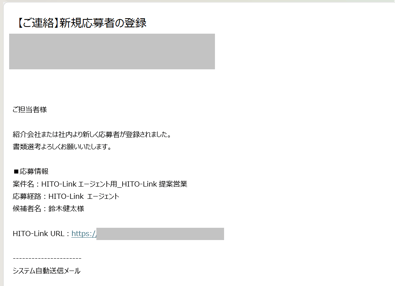 1.HITO-Linkエージェントに掲載している求人に推薦があると、求人の担当者宛に以下のメールが届きます。