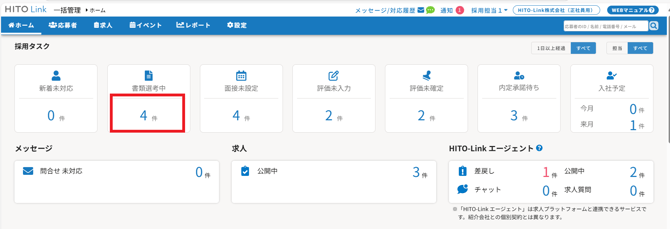2.HITO-Linkにログインし、【書類選考中】の数字をクリックしてください。