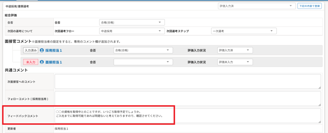 紹介会社宛に合否連絡を行う際に、フィードバックを行いたい場合は【共通コメント】のフィードバックコメントを入力してから合否を登録してください。