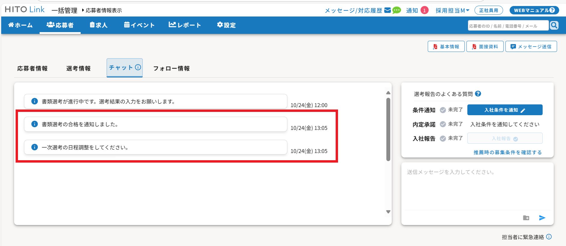 3.テンプレートを登録している場合はテンプレート名を選択し、必要に応じて本文を修正し確認後送信してください。登録後に合否通知とチャットが送信されています。